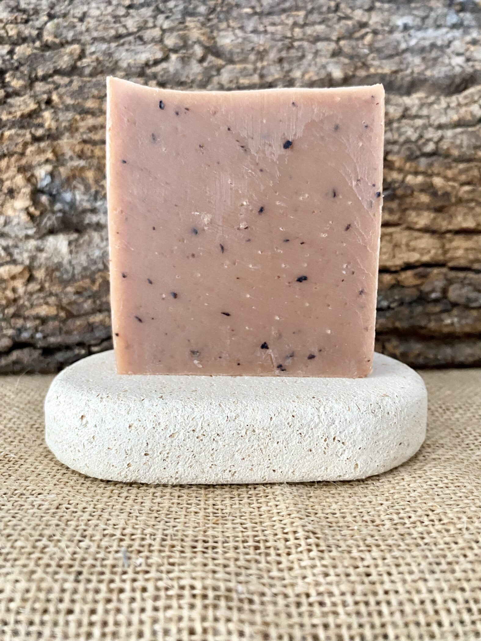 Ingrédients saponifiés : Huile d’olive*, eau, Huile de coco*, Beurre de karité*, soude, Huile de tournesol*, Beurre de cacao*, Huile d’amande douce*, Poudre d’amande*, Argile rouge.